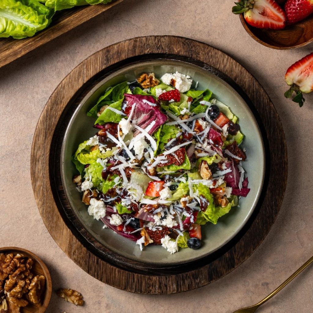 A refreshing burst of color and flavor—crisp baby cos and radicchio meet creamy ricotta and crunchy walnuts, finished with a tangy berry dressing. A perfect start to the festive season.