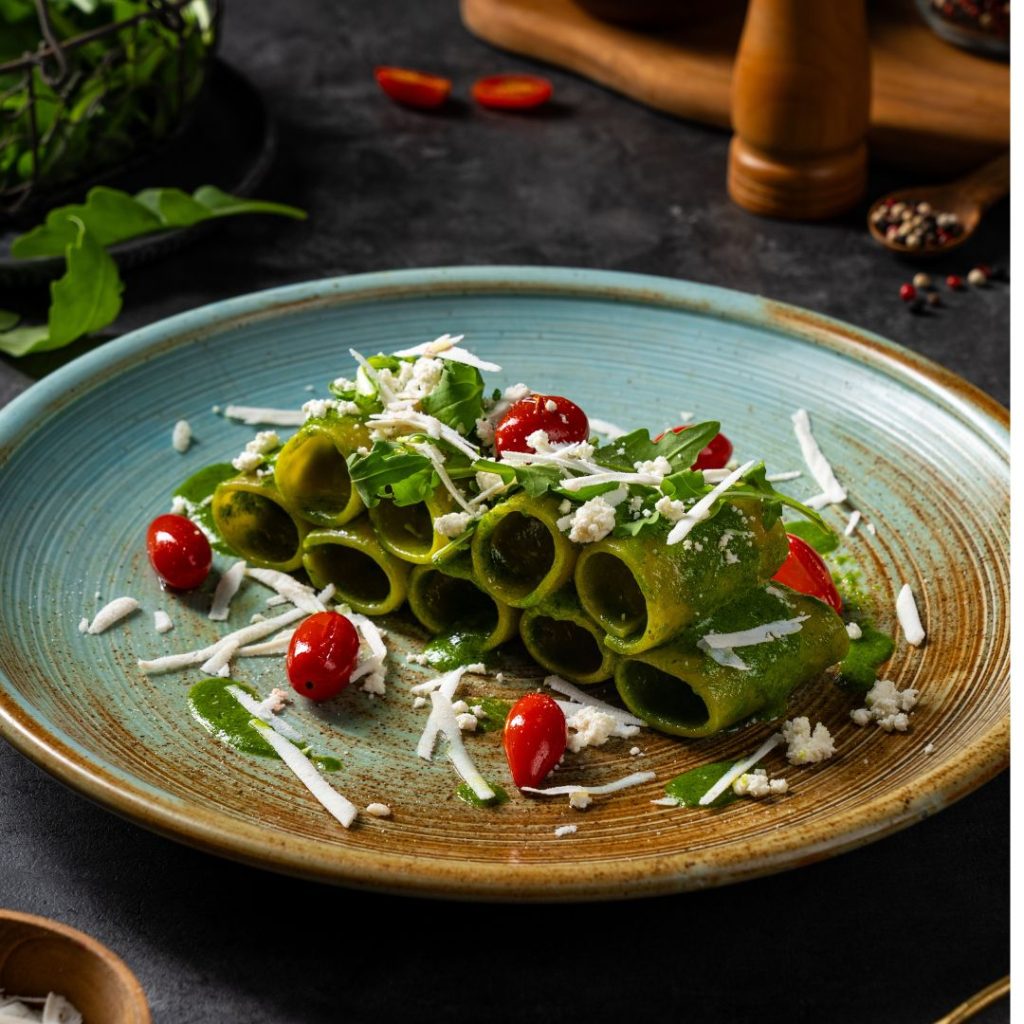 Bold, aromatic rocket pesto wraps around al dente paccheri, with sweet cherry tomatoes and aged sheep ricotta adding depth. A rustic Italian classic with a gourmet twist.