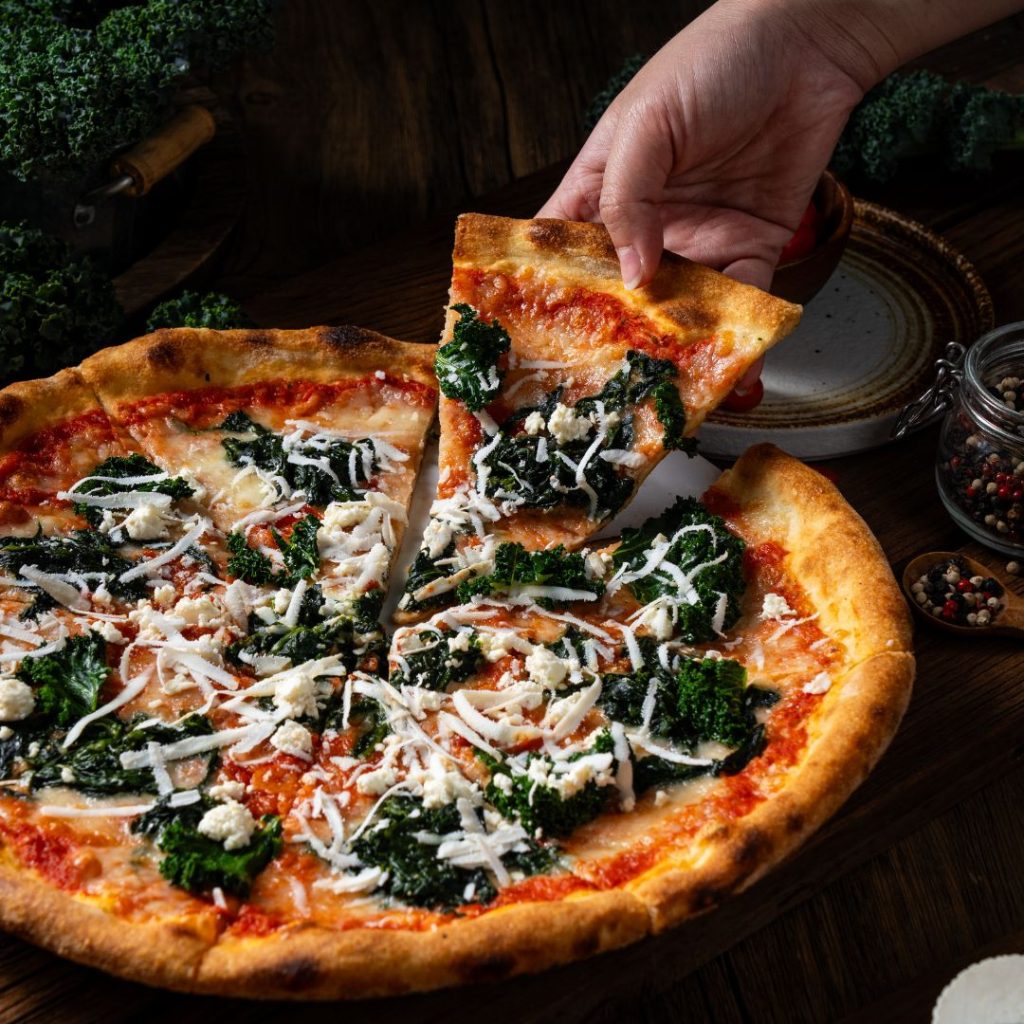 Our festive pizza features golden mozzarella, sautéed kale, and a generous sprinkle of salted ricotta. Earthy, creamy, and utterly satisfying—perfect for sharing.