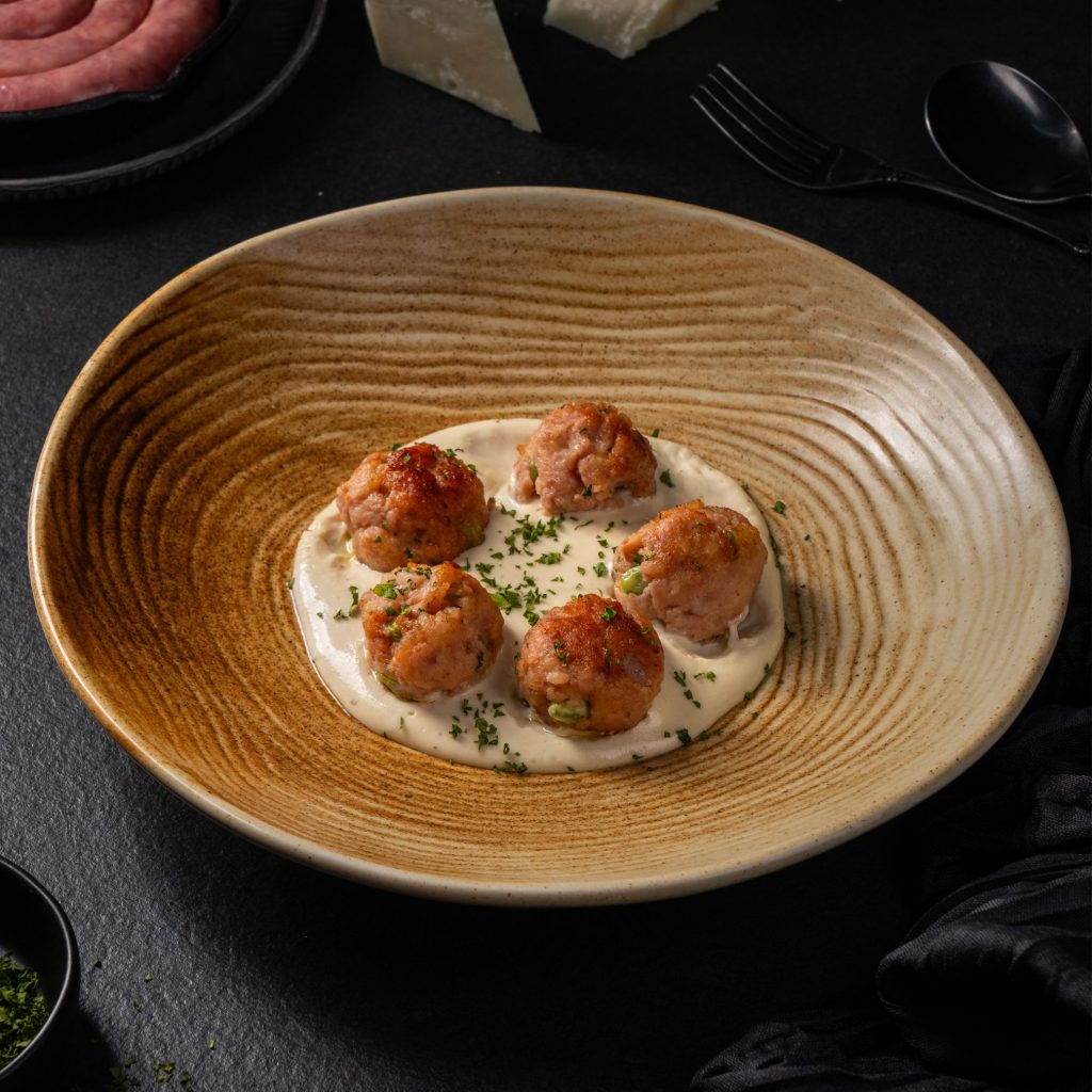 Petite salsiccia and fava bean meatballs crowned with airy pecorino foam where rustic Italian flavors meet refined elegance.